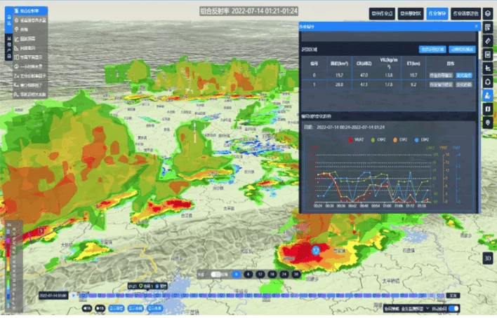 The system integrates weather radar, cloud radar and ground observation data, and adopts algorithms such as clustering statistics and machine learning to form localized model parameters for the characteristics of regional meteorological processes, so as to enhance the efficiency and accuracy of the silhouette hail elimination and rain enhancement operations by means of automated early warning, intelligent operation decision-making and command, and parametric operation effect inspection. Integration of weather radar, cloud radar and ground observation data, the construction of a three-dimensional monitoring network of the weather process intelligent identification of weather targets, dynamic monitoring of target development and change process hierarchical early warning and forecasting, intelligent generation of operational information; scientific command of the implementation of operations, real-time tracking of the operational status of multi-parameter assessment algorithms, localized early warning model.